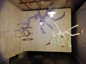 My studio is situated in an concrete cellar where my colleagues are mainly spiders. They are trying try to hang on to the world by knitting theis nets in some might say pretty hostile environment. In this way they are adapting to the situation and perceive their reality and hopefully sometimes manage to catch a fruitfly got lost in the basement. As a comparison, an artist is using her hands, knowledge and expertise, when commencing glueing, welding and sewing together seemingly incompactible elements of the piece of art. In this way, with any luck, the net of new consciousness might catch perhaps suprising intepretations of surrounding reality.