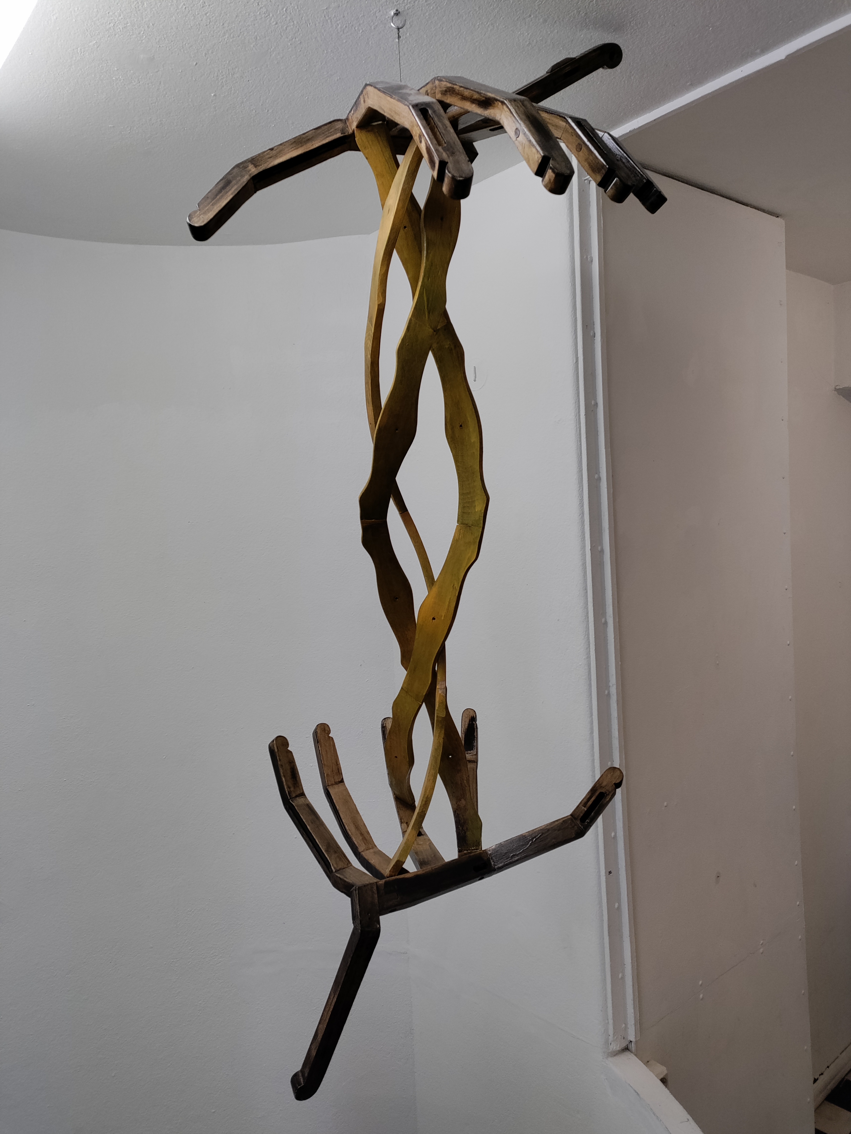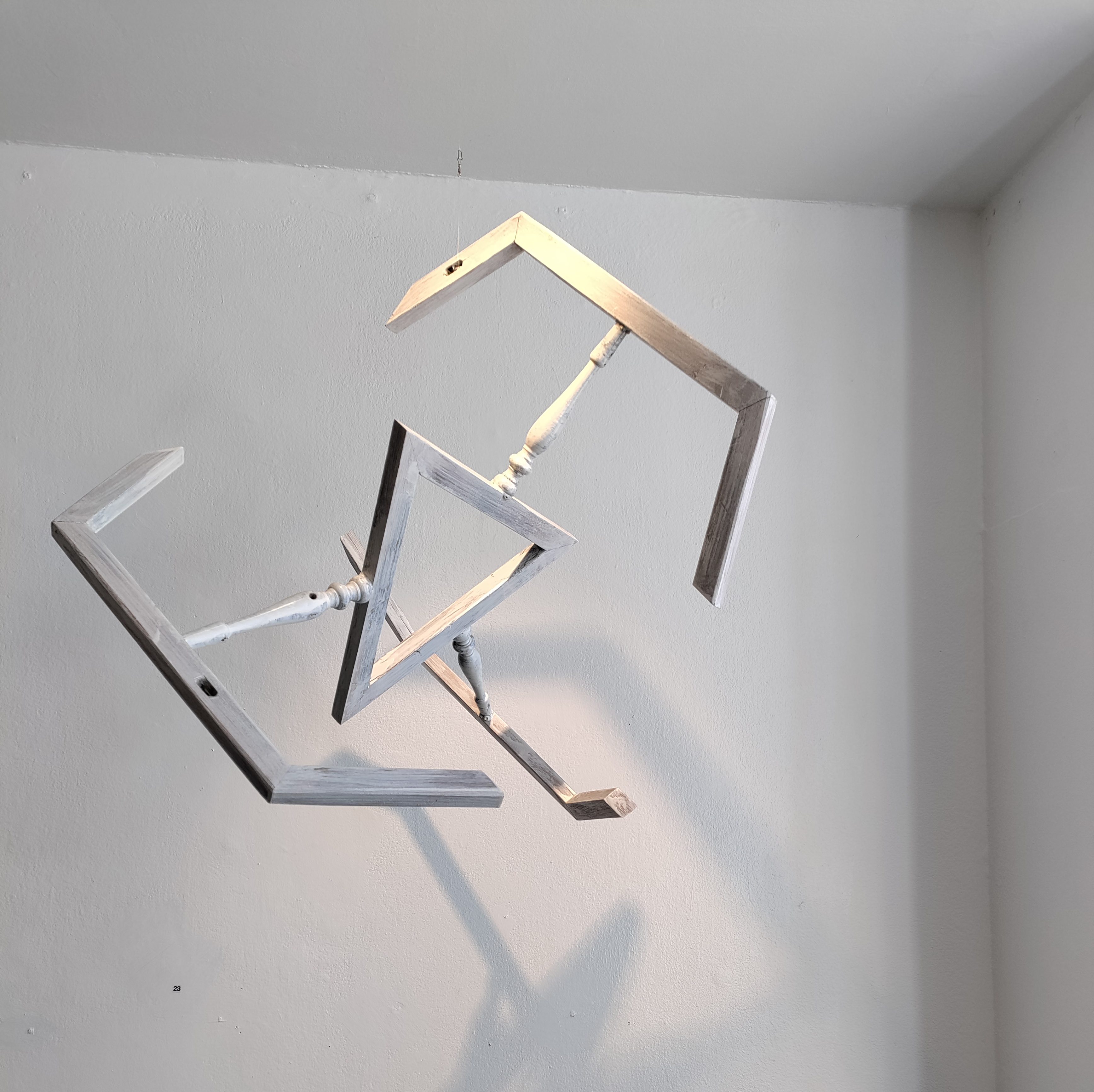 As basic material for my Mixed Waste Method, I exploit reclaimed junk. In this particular exhibition, the nuclear parts are three sets of dining chairs. These sets I have already used for installations and also as funtional construction in my garden. The process got started immediately as I saw the furniture thrown away, I was inspired in a way of building own hut as a little boy. Apparently the repeating forms and architectural mood were tickling my aesthetic instinct, and the temporary finishing line for this process is accomplished in this exhibition: Ragnile.